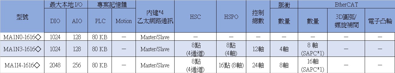 *1 SAPC (single axis positioning control) 單軸位置控制。MA/MQ 部分機型Eth/EC埠可切換支援Ethernet/EtherCAT